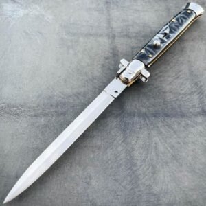 The automatic Italian stiletto knife has a great vintage look that will be appreciated by knife collectors and a solid blade that will get the job done. Using the stainless steel blade is quick and easy when you press the button on the handle. The handle scale is completed with polished stainless steel bolsters. The overall 13″ stiletto knife can be stored in the included nylon pouch.