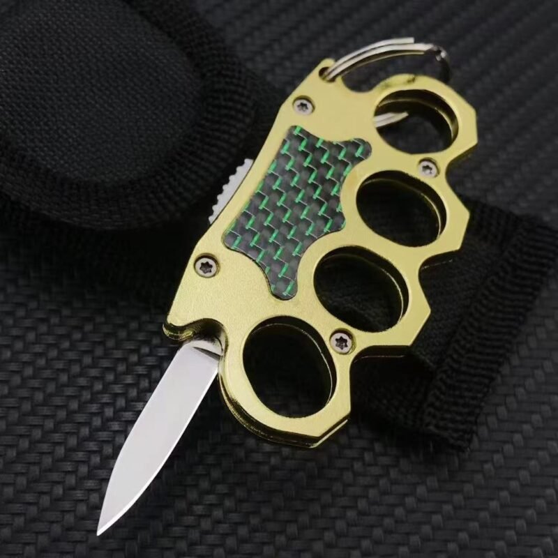 Overall Length: 9 Inches Blade Length: 3.5 Inches Closed Length: 5 Inches Blade Material: 440 Stainless Steel Blade Thickness: 2mm Sharpness & Functionality: Sharp, Novelty Cutter Blade Features: Spear Point Sharp Blade Handle: Gold with Carbon Fiber Inlay Other Features: Out The Front, Switch Toggles In and Out, Glass Breaker Finish: Black and Silver Blade, Gold & Carbon Fiber InlayBIKER KNUCKLE OTF KNIFE&DEFENDER BRASS KNUCKLE SWITCHBLADE