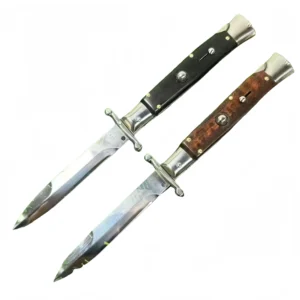 Overall Length: 9 Inches Blade Length: 3.5 Inches Closed Length: 5 Inches Blade Material: 440 Stainless Steel Blade Thickness: 2mm Sharpness & Functionality: Sharp, Novelty Cutter Blade Features: Spear Point Sharp Blade Handle: Gold with Carbon Fiber Inlay Other Features: Out The Front, Switch Toggles In and Out, Glass Breaker Finish: Black and Silver Blade, Gold & Carbon Fiber InlayBIKER KNUCKLE OTF KNIFE&DEFENDER BRASS KNUCKLE SWITCHBLADE